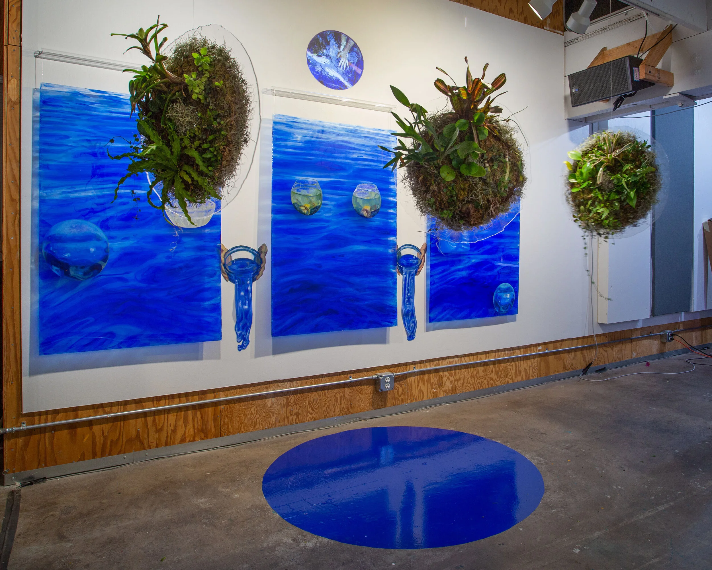 Plants, moss, oil paint handmade from flowers and algae, glass, metal, flowers, rocks,